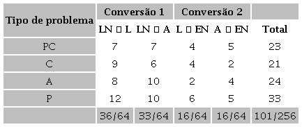 Na Tabela 2 é possível observar os resultados por tipo de problema. Percebe-se que o desempenho é semelhante para os problemas de produto cartesiano, combinação e arranjo. Já os problemas de permutação apresentam, quantitativamente, um melhor desempenho. Apesar disso, quando se analisa a conversão para Expressão Numérica (EN), percebe-se que, nas situações de produto cartesiano, dos 14 acertos na primeira conversão, 9 também acertam a segunda. Já nos problemas de permutação, são 22 acertos na primeira conversão e, desses, 11 acertam a segunda conversão.