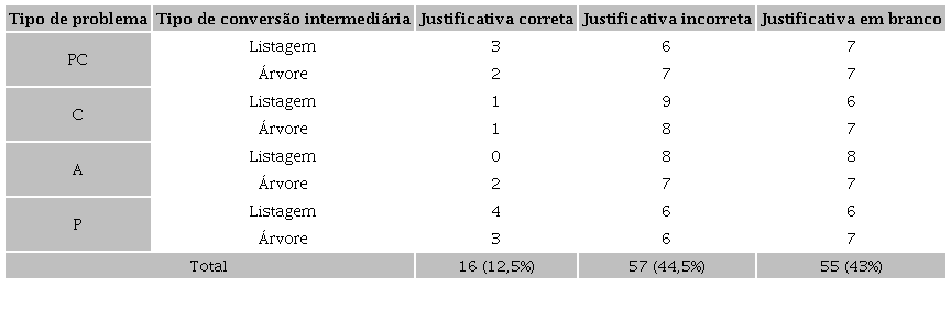 O registro de partida, em língua natural, passou por um registro intermediário (árvore ou listagem) até o registro de chegada em expressão numérica, entretanto, ao final, era solicitada uma justificativa em que se esperava que os alunos escrevessem em língua natural. Essa atividade, de apresentar justificativas em linguagem natural, se caracteriza numa conversão muito difícil, que apresentou um alto índice de respostas em branco, o que ratifica a sua complexidade.