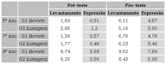 Apesar de ambos os grupos avançarem em seus desempenhos, destaca-se que os grupos que trabalharam com a árvore de possibilidades (G1) apresentaram melhores médias em todos os anos escolares pesquisados, e, além disso, destaca-se que nesses grupos houve maior número de acertos nas situações da segunda parte do pós-teste, com maior número de possibilidades do pós-teste, indicando diferença significativa com o G2, uma vez que, o acerto desses problemas estava diretamente relacionado com o uso do PFC ou de uma generalização de possibilidades.