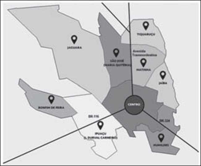 Feira de Santana, município localizado no Território do Portal do Sertão1, está a 107 quilômetros da capital baiana. Com uma população de aproximadamente 750 mil habitantes, é atualmente a segunda maior cidade do estado em termos de população. A divisão geográfica do município é marcada pela presença da zona urbana e da zona rural, sendo esta última composta por oito distritos, como se vê na Figura 1.