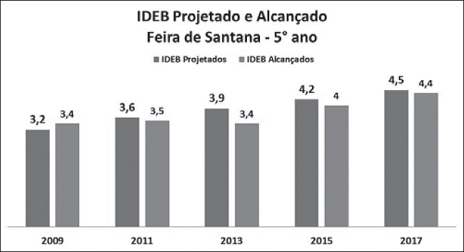 Em termos de avaliação institucional, percebe-se que, segundo o IDEB, o município feirense não tem alcançado os patamares definidos pelo Ministério da Educação.