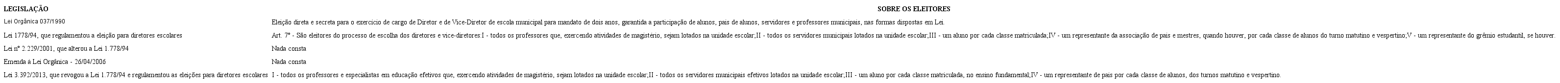 A Lei 2.229/2011 não faz referência aos eleitores nem ao seu quantitativo, prevalecendo as deliberações emanadas pela Lei 1.778/94. Já a Emenda à Lei Orgânica, de 26 de abril de 2006, não faz referência aos possíveis eleitores de diretores e vice-diretores de escolas municipais, como também suprime do seu texto qualquer referência ao processo eleitoral de dirigentes escolares. Assim, a eleição, em 2006, continua regulamentada pela Lei 1.778/94.
