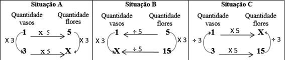 Notemos que, em cada uma das situações (A, B e C), existe uma relação quaternária, que envolve quantidades de naturezas distintas (vasos e flores) e que essa relação estabelecida sempre parte da unidade. Entretanto, o posicionamento do termo desconhecido (x) evidencia que a natureza da situação não é a mesma, o que irá requerer operações aritméticas distintas. Notemos, ainda, que, em todas as situações, é possível lançar mão da relação funcional ou escalar.