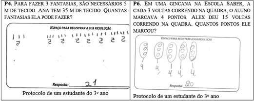 Estratégia 3 (E3): adição repetida - caracteriza-se pela opção de os estudantes em registrarem uma adição, numérica ou icônica, de parcelas repetidas em sua ação na resolução do problema. Entendemos que, ao fazer uso desse tipo de estratégia, o estudante demonstra que se encontrar em uma fase de transição entre o raciocínio aditivo e o multiplicativo (Magina, Santos, Merlini, 2014, p. 528). “Tal estratégia aproxima-se do pensamento multiplicativo, mas está ancorada no raciocínio aditivo, isto é, forma grupos de mesma quantidade para então efetuar a operação de adição”. A Figura 6 apresenta dois protocolos que exemplificam esse tipo de estratégia.