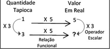 Ao utilizar o operador escalar (3), encontrado na relação entre as quantidades de uma das medidas (no caso, as tapiocas), precisamos aplicá-lo na relação a ser estabelecida entre as quantidades da outra medida (valores em reais), para manter a proporcionalidade e, dessa forma, encontrar o valor desconhecido (a solução para o problema). O raciocínio é sempre de proporcionalidade: se a relação entre medidas de uma das naturezas envolvidas na situação é estabelecida pela multiplicação ou divisão com um operador escalar, esse operador deve ser utilizado, com a mesma operação, para manter a relação entre as medidas da outra natureza.