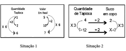 Um outro esquema a ser utilizado na Situação 1 seria o de encontrar a relação funcional entre as quantidades 2 tapiocas e 10 reais. Nesse caso, seria: 2 x 5 = 10 (fator funcional: x 5) e então aplicar esse mesmo fator para as 6 tapiocas. O estudante poderia igualmente lançar mão dessa estratégia para resolver a Situação 2, encontrando a relação funcional entre as grandezas da situação (4÷2 = 2, ou seja, fator funcional: x/2) aplicando-a, então, para as 12 tapiocas.