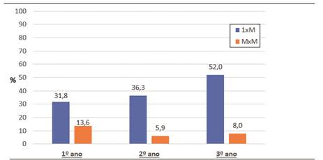 O Gráfico 1 mostra que, quando analisamos os desempenhos dos estudantes nas situações um para muitos, nos três anos escolares, verificamos que existe diferença significativa entre eles (c2(2) = 17,064; p < 0,001). Todavia essa diferença não se confirma entre o 1º e o 2º ano (c2(1) = 0,391; p =0,531), indicando que o grupo o qual apresenta comportamento diferente dos demais é o 3o ano, cujo percentual de acerto foi maior que o dos dois anos anteriores.