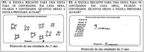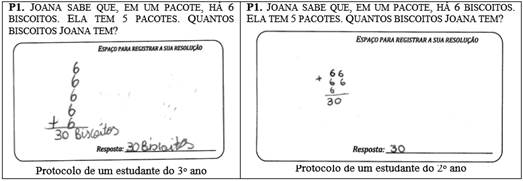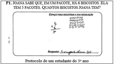 Consideramos a possibilidade de haver uma relação entre o desempenho dos estudantes e o fato de a estrutura multiplicativa costumar ser pouco ou nada trabalhada na escola até o 4o ano e quando o é, tem uma conotação de adição repetida (muitas vezes relacionada à tabuada). Contudo, essa visão se apoia, de sobremaneira, em nossa vivência com a formação de professores dos anos iniciais do Ensino Fundamental, o que reconhecemos ter pouco poder de generalização. O que temos visto é a escola reservar os dois primeiros anos escolares, e, algumas vezes, o 3o ano também, para a estrutura aditiva. A estrutura multiplicativa tem espaço nos 4o e 5o anos, quando costuma ser trabalhada de maneira formal, por meio da tabuada e do ensino da operação de multiplicação, seguido da divisão. Assim, acreditamos que ao investigar as estratégias de estudantes dos 1o e 2o anos, não encontraremos estratégia canônica (aquelas ensinadas pela escola, que segue o rigor formal da Matemática) nas resoluções das situações-problema. Por outro lado, entre os estudantes do 3o ano, é possível que apareça alguma (poucas) estratégia formal, talvez até misturadas com ações informais.