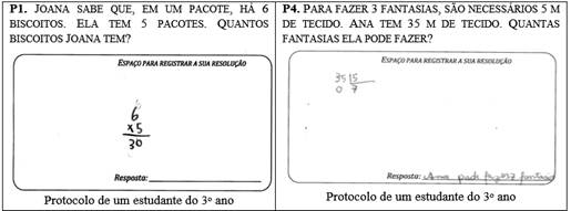 Estratégia 5 (E5): uso de operações multiplicativas - caracteriza-se pela ação do estudante em lançar mão de uma operação aritmética (multiplicação ou divisão) de maneira canônica, para buscar a solução do problema. Essa estratégia, tal qual a anterior, foi usada apenas por estudantes do 3º ano. Na sequência, apresentamos, na Figura 8, dois exemplos (um de multiplicação e outro de divisão).