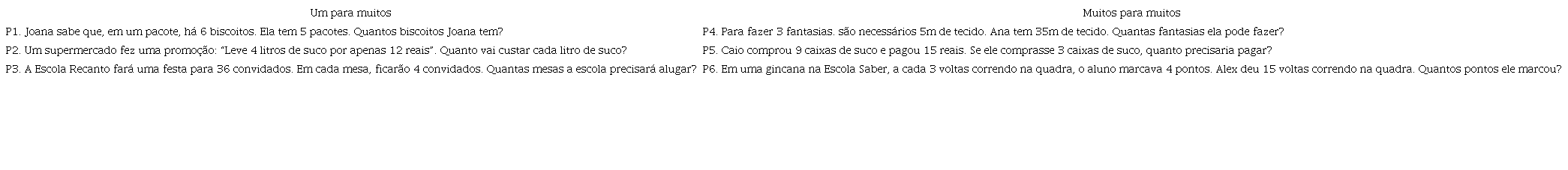 Para construir essa base do conhecimento proporcional, precisamos, também, compreender que as situações de proporção se estabelecem a partir de duas classes: um para muitos e muitos para muitos, discutidas por nós em vários estudos (Magina; Santos; Merlini, 2014; Santos, 2015; Magina; Merlini; Santos, 2016; Magina; Fonseca, 2018). Na classe um para muitos, a menor relação possível entre as medidas das grandezas envolvidas na situação está sempre explicitamente posta (1 tapioca custa 5 reais).