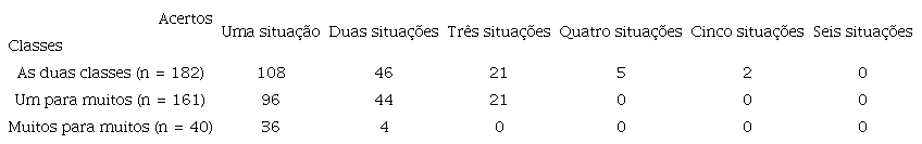 Notemos que a primeira linha apresenta as respostas dos 182 estudantes (independente de ano escolar, ou do tipo de classe a que pertence o estudante - um para muitos ou muitos para muitos). Assim, por exemplo, temos que 108 estudantes acertaram apenas uma situação, podendo esta ser da classe um para muitos ou muitos para muitos. Da mesma forma, e ainda olhando para essa linha, temos que cinco (05) estudantes acertaram quatro situações. Essas quatro situações podem ser três da classe de um para muitos e uma da de muitos para muitos, ou ainda, duas da classe um para muitos e duas da de muitos para muitos. Não poderá ser três da classe de muitos para muitos e uma da de um para muitos, porque nenhum estudante acertou as três situações da classe de muitos para muitos. Por outro lado, nas segunda e terceira linhas da Tabela 1, o valor de “n” não bate 182 e tampouco é o dobro. Na verdade, ela parece indicar que seriam 201 estudantes (161 + 40), mas não é assim. O que ocorre é que houve casos em que o estudante foi contado duas vezes, porque ele acertou, por exemplo, duas situações da classe um para muitos (e aí ele é um dos 46 estudantes) e também acertou uma situação da classe muitos para muitos (fazendo parte dos 36 estudantes).