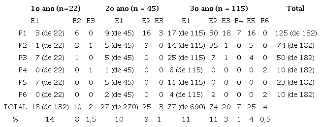 Queremos, ainda, chamar à atenção para: primeiro, os estudantes dos três anos tiveram comportamentos similares no sentido de ter sido a E1, seguida pela E2, as estratégias mais comumente utilizadas; segundo, a E1 pode ter sido “um chute”, uma contagem ou até uma operação mental desses estudantes. Mas o que importa aqui é que o estudante não soube (ou não pôde, ou não quis) registrar o caminho que seguiu para encontrar seu resultado. É importante informar que, durante toda a aplicação do teste, os pesquisadores enfatizaram e estimularam constantemente o registro de suas resoluções. O caso de não saber ou não poder registrar nos remetes ao uso implícito do invariante (Vergnaud 1994, 1998).
