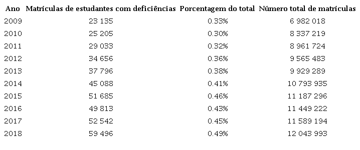 O número de matrículas de estudantes com deficiência em universidades brasileiras cresceu de 23 135 para 59 496 entre 2009 e 2018, o que representa um aumento de aproximadamente 257%, enquanto o número total de matrículas representa um aumento de 172,5%. Se considerarmos o número total de matrículas e compará-lo ao número de matrículas de estudantes com deficiência, observamos que a representação de estudantes com deficiência em universidades varia entre apenas 0,33% e 0,49%, no período analisado. Ademais, considerando o número total de pessoas com deficiência com 15 ou mais anos de idade em 2010 (11 355 906), sua representação nas universidades cai para 0,2% e 0,5%, em 2009 e 2018, respectivamente. De forma similar, no nível de instrução visado (2 009 995) em comparação com o de matrículas indica uma variação entre 1,15% e 2,96%.