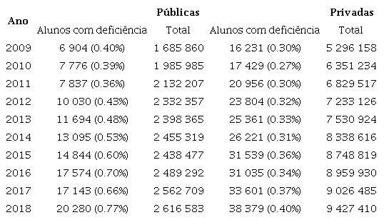 A expansão de universidades privadas brasileiras é enfatizada pela taxa de crescimento em matrículas, representada por 155,2% em universidades públicas e 178% em universidades privadas. À primeira vista, a presença de estudantes com deficiência em universidades privadas parece ofuscar o avanço das instituições públicas - uma análise mais acurada dos números e porcentagens, no entanto, pode indicar o contrário. Em 2009, 6 904 estudantes com deficiência estavam matriculados em universidades públicas, um número que cresceu para 20280 em 2018, ou um aumento um pouco acima de 193%. Por outro lado, os números em universidades privadas cresceram 137%, de 16 231 para 38 379. Ao mesmo tempo, alunos com deficiência de universidades públicas representavam apenas 29,84% em 2009 e 34,6% em 2018, destacando a dominância de instituições privadas de ensino superior no país.
