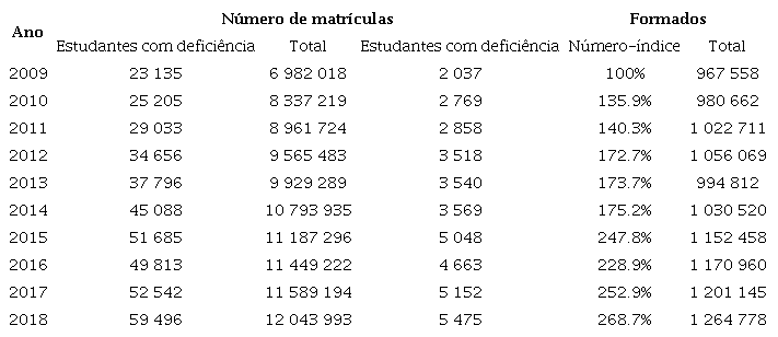 Adotando 2009 como uma referência (número-índice), no período analisado houve um aumento de 268,7% de formados. Apesar da aparente melhora, a diferença entre aqueles que se matricularam e aqueles que se formaram é problemática. A porcentagem de estudantes que se formaram varia de 9,5% (2014) a 13,8% (2009). Ao considerarmos somente estudantes com deficiência, os números caem para uma variação de 7,9% (2014) a 10,9% (2010). Os números, portanto, indicam 2014 como a porcentagem mais baixa de formandos e 2009 como a mais alta na totalidade de alunos, e 2010 quando a deficiência estava isolada. Dados indicam que, quando contrastados com o número total de matriculados e formandos, estudantes com deficiência têm menor probabilidade de completar 80% do curso requerido para formatura. Apenas em 2012 (22% e 10,1%) as porcentagens estavam próximas de iguais.