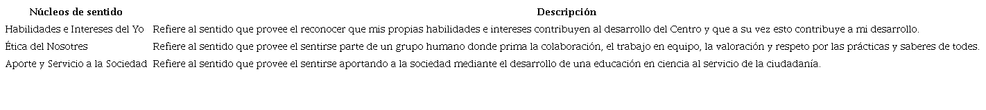 Las reuniones de diseño y rediseño del ICECP fueron el antecedente del Proyecto Sentidos, donde la atención de nuestro trabajo se orientó por primera vez de forma explícita a investigar y analizar el sentido de nuestras prácticas. La relevancia de este proyecto de investigación es que desencadena un proceso de diálogo interno en el Centro, sobre el sentido de su quehacer. El principal resultado, mediante la conversación primero individual y luego grupal, fue la identificación de tres núcleos de sentido del trabajo del Centro, como se muestra en la Tabla N° 1.