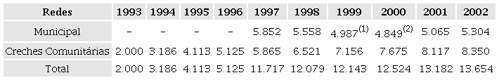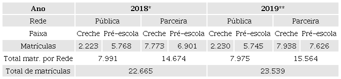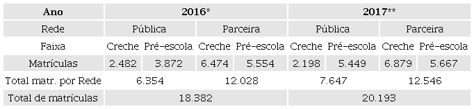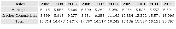 Enquanto na Rede Municipal, em 2012 o número de matrículas na educação infantil era de 5.801, as creches comunitárias conveniadas ofertavam 15.096, ou seja, 160% a mais de matrículas. No entanto, em que pese o crescimento da rede pública, as matrículas ofertadas pelos convênios eram significativamente mais numerosas.