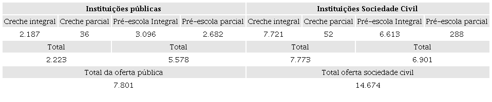 É preciso enfatizar que o poder público lançou mão dos convênios para a educação infantil, em uma conjuntura de passagem das creches, da assistência social, para a educação, da inexistência de um fundo específico para a educação infantil, o que incentivou as parcerias entre o público e o privado para oferta, com a naturalização do possível (Peroni, 2013a). Passadas duas décadas, a situação de excepcionalidade já não persiste e o que se coloca no momento é a necessidade da oferta de educação pública, gratuita, laica e de qualidade para todas as crianças de zero a seis anos de idade - oferta que deve ocorrer dentro de parâmetros de qualidade que respeitem a criança e os seus direitos.