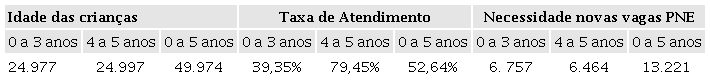 De acordo com os dados do Tribunal de Contas do Estado do Rio Grande do Sul, divulgados em 2018, no documento intitulado Radiografia da Educação Infantil (Quadro 4), que tem como base o censo educacional de 2010, o déficit das matrículas para a educação infantil em Porto Alegre, para o atendimento da Meta 1 do PNE 2014/2024, exige a necessidade da criação de 13.221 vagas na educação infantil, sendo 6.757 matrículas para crianças de 0 a 3 anos e 6.464 matrículas para crianças de 4 a 5 anos.