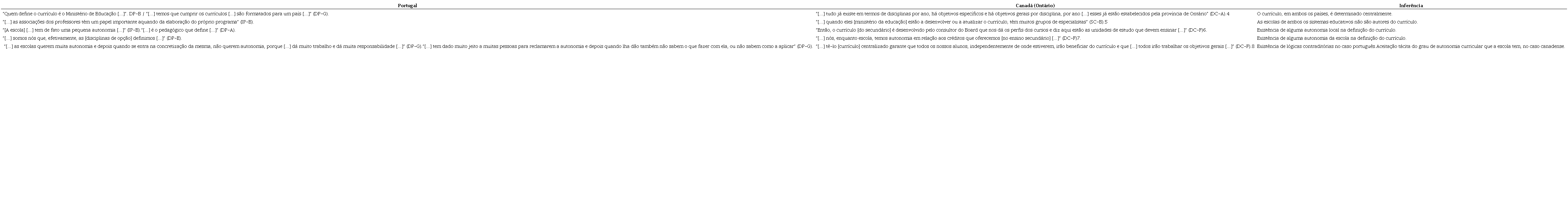 Podemos concluir que, em termos de autonomia curricular, os estabelecimentos de ensino canadenses não têm qualquer intervenção na elaboração do currículo (overall e specific expectations), nem os seus docentes estão representados nas equipes de elaboração dele. Em Portugal, embora não participem na sua globalidade, existem professores dos ensinos básico e secundário nos grupos de elaboração e/ou de consultoria. Contudo, julgamos que o fato de os entrevistados portugueses afirmarem que nas escolas não se sabe quem elabora os currículos seja uma forma de afirmar que os professores não se reveem nessa representação. Assim sendo, não podemos afirmar que os professores portugueses participem da elaboração do currículo, até porque os poucos que fazem parte do grupo de trabalho são selecionados pelo ME e não pela classe docente para a representar.