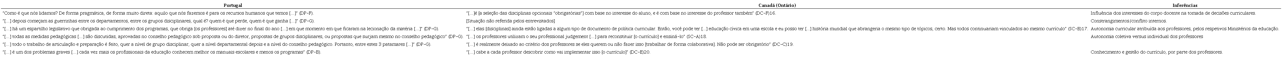 Apesar de o currículo ser definido pelos respetivos governos e as decisões curriculares serem tomadas por entidades locais diferentes – boards e conselhos pedagógicos – os professores – quer pelo coletivo, quer pelo individual – têm graus diferentes de autonomia. No caso português, os professores definem algumas questões curriculares para a respetiva escola, a partir de um currículo nacional, enquanto, no canadense, os docentes decidem em função da especificidade dos alunos da respetiva turma e de acordo com orientações curriculares emanadas pelo board. Esse contexto é contrário ao português, em que existe um currículo nacional que é, predominantemente, igual para todos os alunos da escola. Porém, os testemunhos dos entrevistados nos mostraram que não podemos aplicar a ideia de um currículo uniforme, pronto-a-vestir, de tamanho único, a todo o país (Formosinho, 1987), dado que as escolas tomam algumas, ainda que exíguas, decisões.