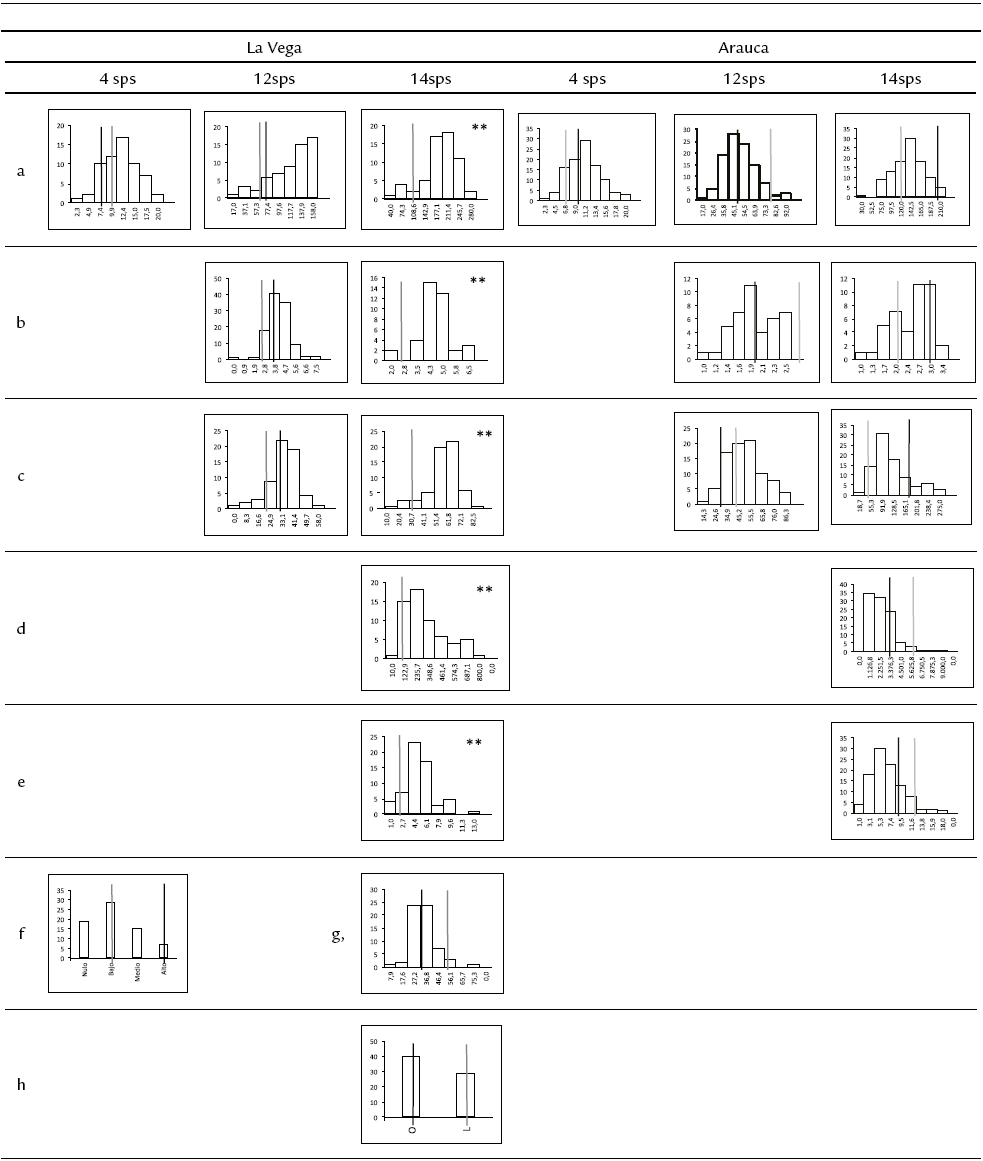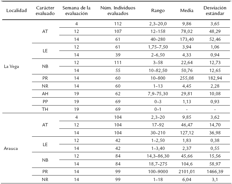 A partir de 133 individuos (códigos) de la familia K, se logró obtener semilla y germinación exitosa para 100 y 105 códigos en La Vega y Arauca, respectivamente. Los individuos fueron fenotipificados para los caracteres morfológicos altura de la planta (AT), longitud entrenudos (LE), número de brotes (NB), número de raíces (NR), peso de raíces (PR), área de la hoja (AH), pigmentación del peciolo (PP) y tipo de hoja (TH). Los caracteres fueron evaluados en diferentes tiempos según características propias de cada rasgo. Así, para AT, LE, y NB se evaluaron a las 4, 12 y 14 semanas post siembra (sps), los valores para los caracteres NR y PR se tomaron a la 14 sps y para AH, PP y TH los datos fueron obtenidos en la 19 sps. No en todos los casos se evaluó el mismo número de individuos en cada semana debido a que se presentó mortalidad en algunas plantas a lo largo del experimento. En la mayoría de los casos se obtuvieron valores para tres plantas por cada código. A partir de los datos obtenidos (aproximadamente 860 en La Vega y 760 en Arauca) se realizó un análisis descriptivo. Para cada carácter evaluado se observa que existen rangos de variación muy amplios, seguramente debido a la alta segregación que presenta esta población, al igual que desviaciones estándar elevadas (Tabla 1). Así por ejemplo para PR se obtuvieron valores que variaron entre 10 y 800, mientras que para NB los rangos estuvieron entre 10 y 83 en La Vega y 18 a 275 en Arauca (Tabla 1). El rasgo morfológico con menor variabilidad fue NR mostrando que el ambiente puede tener bajo efecto sobre este rasgo (Tabla 1).