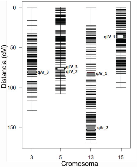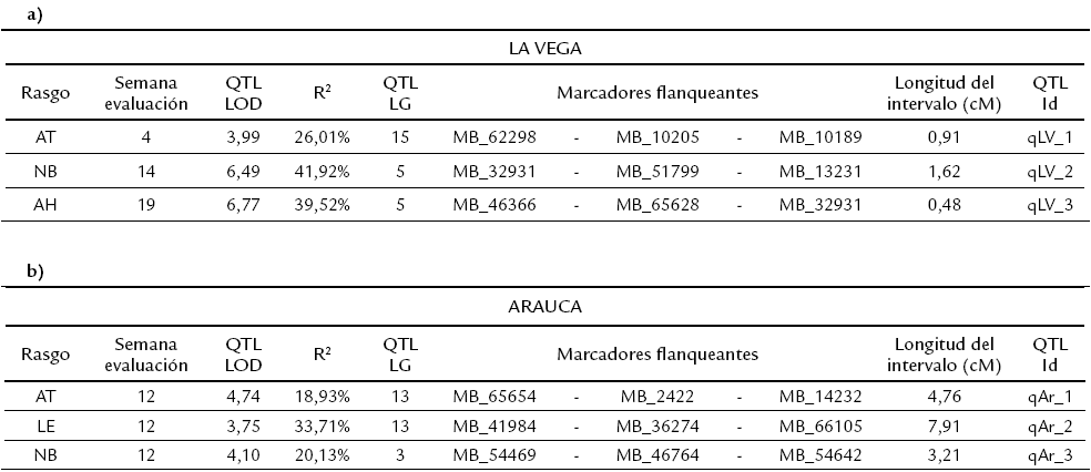 Un total de seis QTLs fueron identificados (qLV_1, qLV_2, qLV_3, qAr_1, qAr_2 y qAr_3) los cuales se encuentran distribuidos en cuatro grupos de ligamiento (LG3, LG5, LG13 y LG15). El porcentaje de la variación explicada por el factor genético (R²) para los diferentes rasgos varió entre 18,93 % y 41,92 % donde el mayor y menor valor de R² corresponde a los rasgos NB en la segunda evaluación en La Vega y a AT en la segunda evaluación en Arauca, respectivamente. En general los intervalos en que se encuentran ubicados los QTLs varían entre 0,48 cM y 7,91 cM. Para el caso de los datos obtenidos de individuos crecidos en La Vega se identificaron tres QTLs (qLV_1, qLV_2 y qLV_3) distribuidos en dos grupos de ligamiento (LG5 y LG15) (Tabla 2a). A partir de los datos obtenidos en la localidad de Arauca se identificaron igualmente tres QTLs (qAr_1, qAr_2 y qAr_3) distribuidos en dos grupos de ligamiento diferentes (LG 3 y LG13) (Tabla 2b).