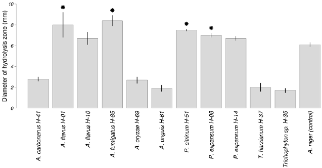 We detected cellulolytic activity in 11 out of the 20 tested morphotypes. Four of them exceeded A. niger (control) cellulolytic activity: A. flavus (H-01), A. fumigatus (H-85), Penicillium citrinum (H-51), and P. expansum (H-08) (all p<0.05, Student’s t-test). Aspergillus flavus (H-10) and P. expansum (H-14) activity was nearly the same as that of A. niger (p = 0.41 and 0.12, respectively) (Fig. 1). All morphotypes exceeded A. niger growth rate in CMC agar. Although growth rate in CMC agar was on average 34.7 % lower than in Sabouraud agar medium, P. expansum (H-08) grew 9.8 % faster in CMC agar than in Sabouraud agar.