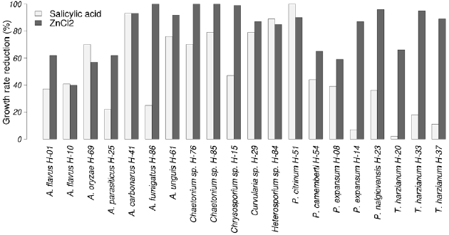 Zinc chloride was the most effective fungicide, it diminished fungal growth rate in all tested morphotypes (all p <0.05; Student’s t -test). Salicilic acid diminished it in all morphotypes as well, except A. flavus (H-10; p = 0.18, Student’s t -test), P. expansum (H-14; p = 0.53, Student’s t -test), P. nalgiovensis (H-23; p = 0.09, Student’s t -test), and T. harzianum (H-20; p = 0.13, Student’s t -test). Zinc chloride and salicilic acid reduced the growth rate in 81.2 % and 49.2 % on average, respectively. The salicylic acid effect was greater than the ZnCl only in P. citrinum (H-51), Aspergillus oryzae (H- 69), and Heterosporium sp . (H-84) (Fig. 2). Benomyl (positive control) reduced fungal growth rate by 95 % on average for all morphotypes except Curvularia sp . (H-29; 68 %).