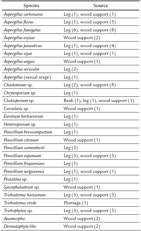 We identified 187 damages in 161 out of 423 bird specimens, of which 26 had more than one injury. Most of them occurred in wood supports (53.5 %) and legs (40.6 %), and to a lesser extent in plumage (4.8 %) and beaks (1.1 %). Injuries were not diverse in aspect. They were primarily pale, gray shaded, flat, scabby, or downy. Their diameters ranged between 3-50 mm. At least 25 fungal species were represented by 86 isolated morphotypes. Of these, 64 % were identified at species level and 30.2 % at genus level only (Table 1). Isolated morphotypes came mainly from wood supports (58.1 %) and legs (39.5 %). Seven specimens had more than one fungal species. The most common genera were Aspergillus (45 %), Penicillium (15.3 %), Chaetomium (10.6 %), Trichophyton (9.4 %), and Trichoderma (7.1 %). The most common species were Aspergillus fumigatus (16.5 %), Aspergillus flavus (7.1 %), and Penicillium expansum (7.1 %). Two anamorphic fungi did not sporulate and two dermatophytelike fungi could not be identified.