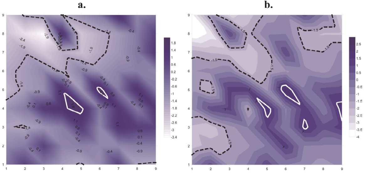 Se encontró un parche para la biomasa de la hojarasca en el cultivo, centrado en (x = 7, y = 4; considerando el origen en la esquina inferior izquierda, punto x = 0 y y = 0) que coincide con parches encontrados para Diplopoda y Gamasida (No Uropodidae). Sin embargo, esta coincidencia no fue significativa para ninguno de los grupos.