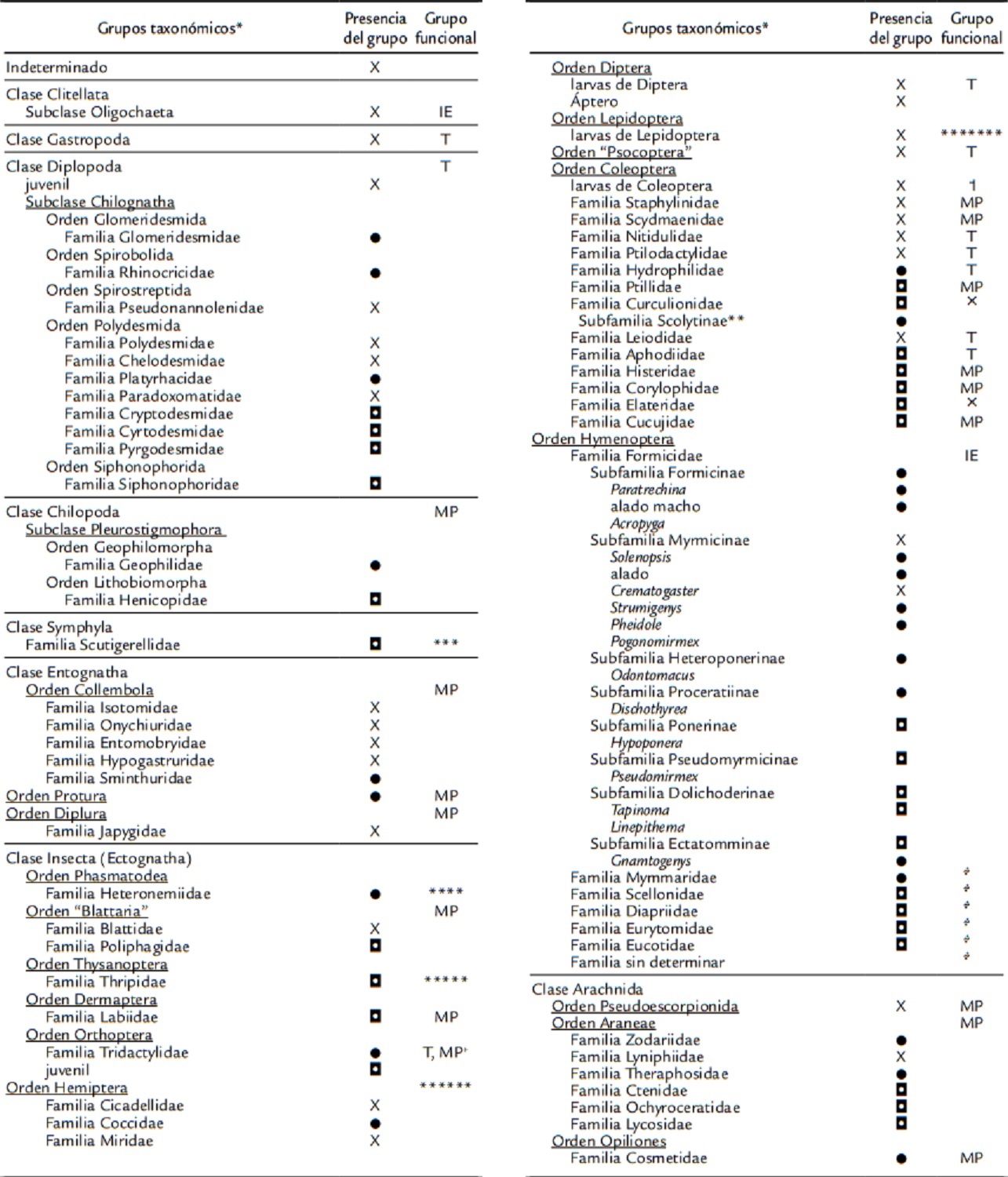 ******* Las larvas de Lepidoptera no fueron clasificadas en ninguno de los grupos funcionales de acuerdo con Lavelle (1996) porque son consideradas fitófagas (Futuyma, 1976). ˦ Las larvas de Coleoptera no fueron clasificadas en ninguno de los grupos funcionales de acuerdo con Lavelle (1996) porque de acuerdo a la especie tienen hábitos muy diversos (Tashiro, 1990) ˟ No fue encontrada información suficiente para establecer el hábito alimenticio de los adultos de la familia. ͋ Fueron considerados como parasitoides.
