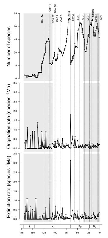 Planktic foraminifers, a group of extant sexually reproducing protists, have been an extremely useful group for testing possible controls on long-term diversity patterns (e.g., Cifelli,1969; Frerichs, 1971; Lipps, 1979; Wei and Kennett, 1986; Schmidt et al., 2004; Ezard et al., 2011; Peters et al., 2013). In part, this is a reflection of their extremely wide biogeographic distribution and the fact that virtually continuous microfossil successions can be accessed through the study of outcrops and especially deep-sea cores dating back to the Bajocian (~170 Ma). Despite the interest in this group, only a few studies have examined possible controls on their long-term diversity dynamics using quantitative approaches (e.g., Wei and Kennett, 1986; Schmidt et al., 2004; Ezard et al., 2011), and these studies have been concentrated on specific time intervals rather than on the group's entire fossil history (e.g., Neogene [~23 Ma to Recent; Wei and Kennett, 1986] and Cenozoic [~65.5 Ma to Recent; Schmidt et al., 2004 and Ezard et al., 2011]). Moreover, even though comprehensive models have been developed to explain underlying long-term diversity dynamics, these likely need to combine 'abiotic' and 'biotic' elements rather to contrast them (Alroy, 2010a); to date only Ezard's et al., (2011) work has employed that approach in examining the role of changing oceanic temperatures and species' ecologies as controls on the Cenozoic diversity pattern.