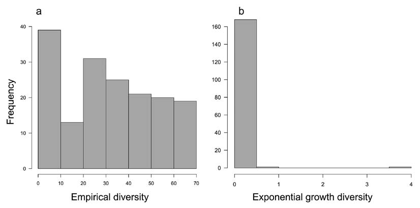 a) Empirical diversity plotted as time-frequency histogram. b) Simulated exponential growth diversity plotted as time-frequency histogram. The exponential values were obtained from the equation Nt = No (l)t , where t is the number of time units, No is the size of the population at the beginning, l is the per-capita rate of increase and Nt is the predicted size of the population after t time units. In the case of the planktic foraminifera t is the interval between 170 to 0 Ma, No is four species, and l was equal to 0.2 (mean origination rate of planktic foraminifera).