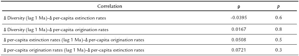 The current results do not support the first two components of this model given the significant negative trends through time for both extinction and origination per-capita rates (ρ = -0.269, p = 4.25*10-4 and ρ = -0.209, p = 6.60*10-3), and the significant, although opposite to the postulated relationship (i.e., positive relationship between origination and standing diversity and negative correlation between extinction and species richness), cross-correlations between changes in both extinction and origination per-capita rates with changes in diversity throughout time. Nevertheless, the presence of a significant positive cross-correlation between origination and extinction per-capita rates suggests that the long-term planktic foraminiferal diversity pattern could be described by a logistic growth pattern with no extrinsic controls and limited only by intrinsic ecological factors (i.e., planktic foraminiferal interspecific competition) as proposed by Webb (1969) and Mark and Flessa (1977). However, the overall logistic growth pattern predicted by this model is not displayed by the planktic foraminifers standing diversity (Fig. 1). Rather than gradually approaching an equilibrium level, the curve is instead characterized by several peaks and troughs, in addition to those reflecting elevated turnover forced by major biotic disruptions (i.e., Aptian-Albian, Cretaceous-Paleogene, Eocene-Oligocene). Given that the data do not match the predicted response, this hypothesis is also rejected for planktic foraminifers.
