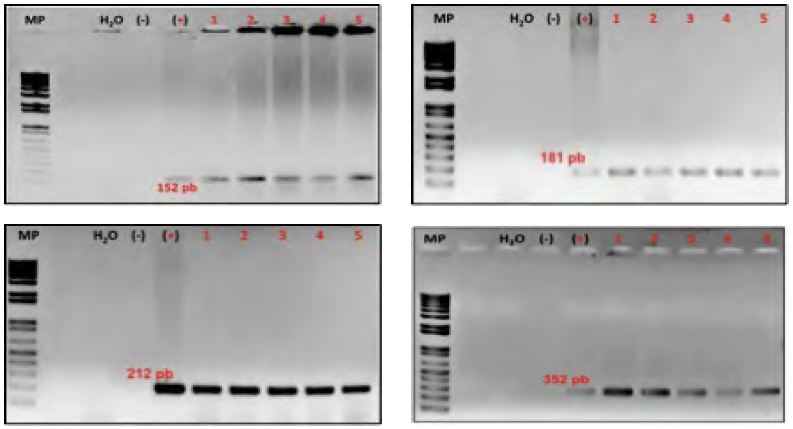 Posterior a la transformación de las bacterias E. coli y A. tumefaciens, se realizó la siembra por agotamiento en el medio de selección. Las colonias que fueron sometidas al análisis de PCR, se subcultivaron en medio LB sólido, con el antibiótico de selección respectivo. El crecimiento de estas colonias en medio de selección, se considera la prueba fenotípica, puesto que no se evidenció crecimiento de bacterias no transformadas, cultivadas en el mismo medio de selección (control). Colonias de E. coli y de A. tumefaciens que fueron subcultivadas en medios de selección, resultaron positivas para PCR, amplificando los fragmentos predichos de los genes CspB (152 pb), TaDREB3 (181 pb) y AtZAT10 (212 pb), contenidos en los vectores de transformación, usados en los experimentos. Se observó que, para ambas cepas recombinantes, se presentó el mismo patrón de bandas en los análisis de electroforesis; las colonias transformadas con cada uno de los plásmidos también fueron PCR positivas para el gen bar (Fig. 2). Se consideran colonias positivas, cuando la banda correspondiente a los amplicones visualizada en la electroforesis en gel de agarosa y tinción con bromuro de etidio, corresponde al tamaño predicho de 352 pb para bar.