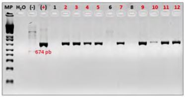 De acuerdo con el resultado del Z-Test (p<0,05), hay diferencias significativas entre el número de plantas PCR positivas para DREB y ZAT10 provenientes de explantes seleccionados con 0,8mg/l y 2 mg/l de PPT, respectivamente. El fragmento esperado que resultó de la amplificación por PCR para CspB, TaDREB3 y AtZAT10, corresponde a 200 pb (5'-ATGCTCGAAGGGAAGGTC-3' y 5'-GCCTCCTTTGTCACATTAGCA-3', 459 pb (5'-GACAGCC GAACAAAAAGTCC-3' y 5'-AAAGTGCCACATCTCCTGCT-3') y 674 pb (5'-GGCGCTAGAGGCTCTGACTA-3' y 5'-GCAGTTTCA CTGGGAAGTCG-3), respectivamente. Se muestran los resultados para AtZAT10 (Fig. 3) resultados similares fueron obtenidos para los otros genes.