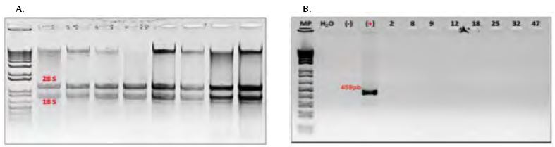 A partir de las plántulas PCR positivas, se tomaron al azar entre cinco a siete plantas para la extracción de ARN, tratado con DNAse I (Fig. 4), antes de ser sometido a PCR y utilizado posteriormente para la síntesis de cADN.