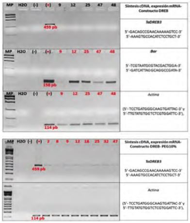 Plántulas regeneradas en medios de selección con PPT a partir de ensayos de transformación independientes con los casetes de expresión correspondientes a CspB, TaDRE3B y AtZAT10, fueron evaluadas mediante PCR con el kit KAPA3G (KAPABIOSYSTEMS) que permite realizar la PCR directamente con el tejido de hoja, con lo que se determinó la presencia o ausencia del transgen. Nuevos cebadores fueron diseñados con el programa Primer3Plus (Rozen y Skaletsky, 2000) de acuerdo a las secuencias nucleotídicas de cada gen. CspB cuyo amplicón esperado es de 200 pb (5'-ATGCTCGAAGGGAAGGTC-3' y 5'-GCCTCCTTTGTCACATTAGCA-3'), TaDREB3 cuyo amplicón esperado es de 459 pb (5'-GACAGCCGAACAAAAAGTCC-3' y 5'-AAAGTGCCACATCTCCTGCT-3'), AtZAT10 cuyo amplicón esperado es de 674 pb (5'-GGCGCTAGAGGCTCTGACTA-3' y 5'-GCAGTTTCACTGGGAAGTCG-3') y bar (5'-TCGTAATGCGTACGACTGGA-3' y 5'-GATCATTA GGCAGGCCGATA-3') cuyo amplicón esperado de 158 pb. De las plántulas caracterizadas como PCR positivas, se eligió por casete de expresión, al azar entre cinco a siete, de acuerdo con el material disponible. Con el fin de comprobar o no la expresión a nivel de mARN, a dichas plántulas se les realizó RT-PCR. Hojas de plantas elongadas de tres semanas de edad contados a partir del paso de los brotes al medio de elongación fueron utilizadas para la extracción de ARN mediante el kit de NORGEN BIOTEK-CORP. El ARN fue sometido a tratamiento con DNAse I, RNase-free (Termo Scientific) y posteriormente se comprobó mediante PCR la ausencia de ADN en las muestras. A continuación se sintetizó cADN con el kit First Strand cDNA Synthesis (Termo Scientific) y a partir de este, se realizaron las PCRs correspondientes. Los primers utilizados en la PCR de ARN tratado con DNAse I y cADNs son los mencionados anteriormente, correspondientes a cada casete de expresión; a excepción de los cebadores para amplificar un fragmento de 114 pb de actina (5'- TCCTGATGGGCAAGTGATTAC-3' y 5'-TTGTATGTGGTCTCGTGGATTC-3'), diseñados por Liu et al., (2012) que fueron usados solamente en la PCR de RNA de las muestras CspB (2, 31, 3, 15, 40, 58 y 67) y DREB (9, 12, 25, 47 y 48) y para el control de la PCR de los cADNs. Por otra parte, teniendo en cuenta que el casete de expresión TaDREB3 fue diseñado con un promotor inducible por sequía, se obtuvo cADN de plantas TaDREB3 elongadas en medio MS y en medio MS + PEG (PM 6000) 10 %, que simula el estrés por sequía.