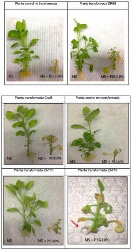 Las pruebas fenotípicas para estrés por sequía in vitro se realizaron durante 20 días, con plántulas positivas para PCR y RT-PCR que expresan CspB, TaDREB3 y AtZAT10 cultivadas en medio MS + PEG10% (PM 6000), al mismo tiempo que plántulas control no transformadas (Shen et al., 2002). Estas plantas se mantuvieron en cuarto de crecimiento en condiciones de 70 % humedad relativa, 28 °C de temperatura y fotoperiodo de 16/8. Cuando hubo necesidad de realizar análisis estadístico se usó el Z-Test (p<0,05).