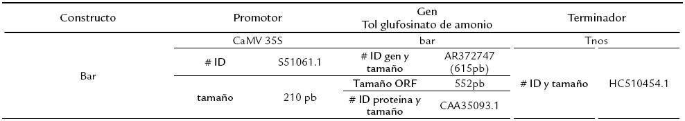 El gen bar de Streptomyces hygroscopicus que confiere resistencia a glufosinato de amonio, usado en los tres casetes de expresión desarrollados en este trabajo, ha mostrado ser un sistema muy eficiente de selección en los protocolos de transformación genética (White et al., 1990). Tiene una amplia historia de uso como marcador de selección y en cultivos GM tolerantes a este herbicida, incluyendo maíz (Gordom-Kamm et al., 1990), arroz (Christou et al., 1991), trigo (Vasil et al., 1992), remolacha azucarera (Beta vulgaris) (D'Halluin et al., 1992), canola (Brassica napus) y alfalfa (Medicago sativa) (Cobb, 1992), algodón (Gossypium hirsutum) (Keller et al., 1997), lechuga (Lactuca sativa) (Mohapatra et al., 1999), caña de azúcar (Saccharum officinarum) (Falco et al., 2000), yuca (Manihot esculenta) (Sarria et al., 2000) y fríjol (Phaseolus vulgaris) (Aragão et al., 2002). En el mundo los cultivos comerciales aprobados, tolerantes a glufosinato incluyen remolacha azucarera, canola, soya, arroz y maíz. Unas pocas líneas híbridas de maíz resistentes están registradas por Dekalb (adquirida por Monsanto), Mycogen (adquirida por Dow Agrosciences) y Syngenta. Una variedad de achicoria (Cichorium intybus) con esterilidad masculina que lleva el gen se registró por Bejo Zaden, NL (PatentLens, 2007).