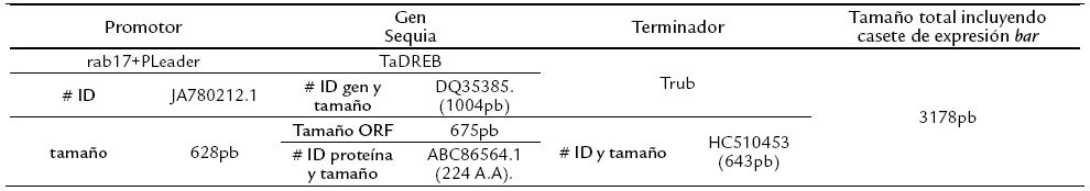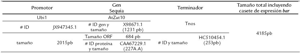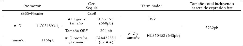 Cada una de las secuencias génicas se diseñaron, dirigidas por un promotor constitutivo de la siguiente manera: i) CspB,dirigido por CaMV35s potenciado, y una secuencia líder se petunia (E35S+Pleader), ii) AtZAT10, dirigido por la región promotora de la Ubiquitina de maíz Ubi-1 y iii) bar, dirigido por CaMV 35S. El gen TaDREB3 fue dirigido por el promotor inducible por sequía rab17. La región terminadora de CspB y TaDREB3 fue el terminador de la RuBisCo (Trub), mientras que la región terminadora de AtZAT10 y Bar fue el de nopalina sintasa (Tnos). En todos los casos, para separar el constructo del gen que confiere tolerancia a sequía del constructo del gen bar, se introdujo una región no codificante (intrón) de cloroplasto de Acer pseudoplatanus (Taberlet et al., 1991), que cumple el papel de espaciador. A continuación se muestra la composición detallada de cada uno de los constructos: el número de identificación (# ID) en el GenBank de las secuencias nucleotídicas (promotoras-codificantes-terminadoras) y aminoacídicas, el tamaño en pares de bases (completa/ORF) y aminoácidos, respectivamente (Tab. 1, 2, 3 y 4).