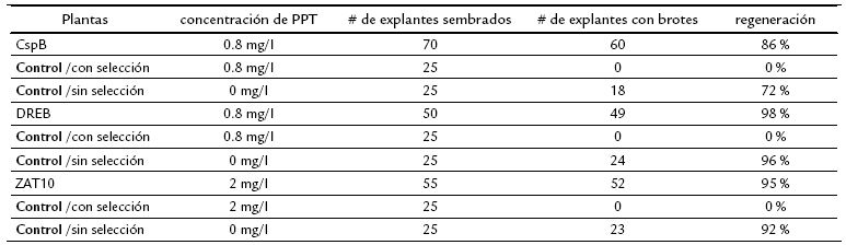 En el primer ensayo de transformación, la selección se llevó a cabo con 0,8 mg/l de PPT (Jimenéz, 2013). En el ensayo con CSPB se tomó la mayor cantidad de brotes PPT resistentes, varios por explante. En el ensayo con TaDREB3 y con AtZAT10 se tomó un único brote por explante, con el propósito de asegurar eventos de transformación independientes. Para corregir el efecto de escapes por baja presión de selección, se repitió el ensayo de transformación AtZAT10 incrementando la concentración del PPT a 2 mg/l.