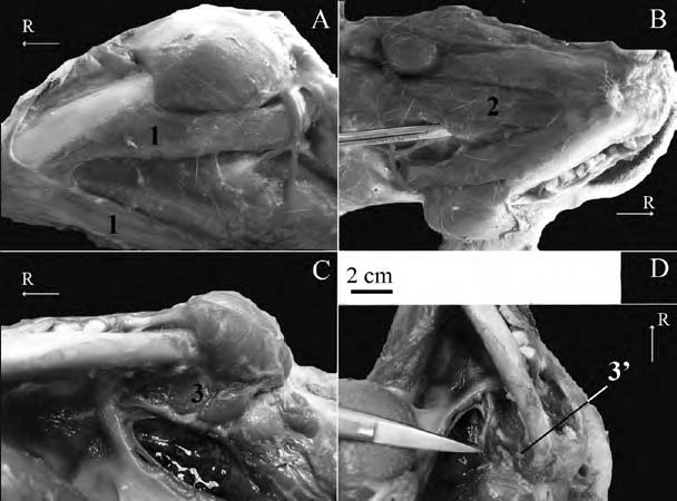 A-D. In ventral view. References: R, Rostral; 1, Digastricus; 2, Mylohyoideus; 3, Pterygoideus medialis; 3’, Pterygoideus lateralis.