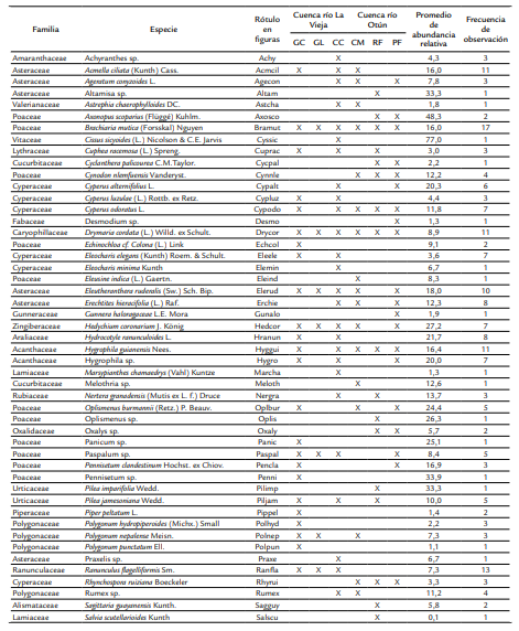 En la Tabla 1 se listan las especies y familias encontradas en los 18 sitios de muestreo y se discrimina su distribución por sistema productivo. Se presentan también los datos de abundancia y frecuencia relativas para cada especie. Se encontró un total de 54 especies pertenecientes a 25 familias. De las 54 especies encontradas, 40 fueron identificadas hasta especie y 14 hasta género. Las familias más representadas fueron, en su orden: Poaceae (11 especies), Asteraceae (7 especies), Cyperaceae (6 especies) y Acanthaceae (3 especies). La vegetación vascular presente en los ríos andinos muestreados es emergente, excepto por Eleocharis minima (Kunth) macrófita semisumergida encontrada en la finca El Descanso, en la cuenca del río La Vieja.
