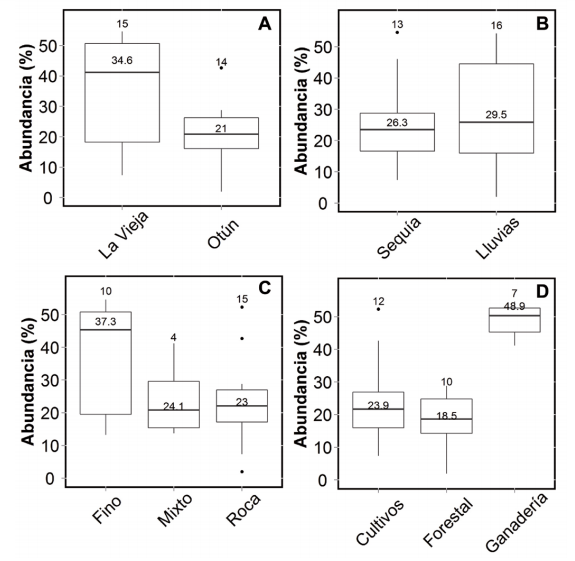 Los sistemas productivos de ganadería presentaron valores significativamente más altos en la abundancia de macrófitas (F(2,26) = 21,2, p < 0,001). Los ríos de los sistemas de ganadería mostraron un promedio de abundancia relativa de 48,9 % mientras que los sistemas de cultivos y forestales presentaron un promedio de 23,9 % y 18,5 %, respectivamente.