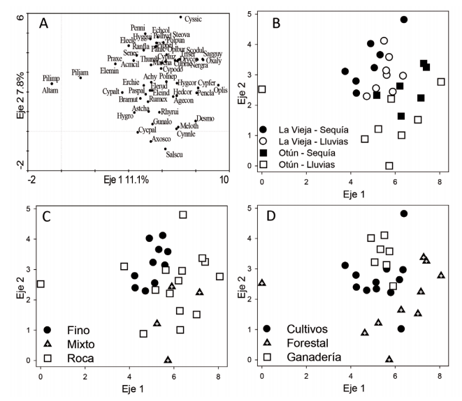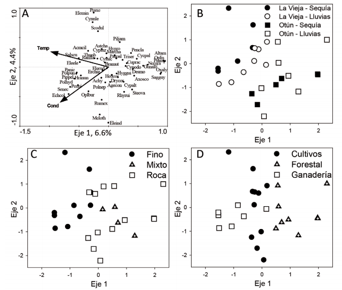 El ACS explicó en dos ejes un 18,9 % de la variabilidad de los especies (Fig. 5). El primer eje mostró una discriminación de los ríos de las dos cuencas y una gran diferencia de la comunidad de macrófitas del río La Aurora, en donde Pilea imparifolia y Altamisa sp. fueron las especies dominantes. El eje también mostró una ligera discriminación de los ríos en función de la estacionalidad, con una abundancia ligeramente más alta de especies como Eleocharis elegans, Eleocharis minima, Pennisetum clandestinum (Hochst. ex Chiov.) y Cyperus odoratus (L.) durante el periodo de sequía. El segundo eje del modelo discrimina las cuencas, el sistema productivo y, parcialmente el sustrato de los ríos. El análisis sugiere una mayor similitud en las comunidades de las muestras de los ríos de los usos de suelo Ganadero y Cultivos, mientras que las comunidades de los ríos del uso forestal presentaron grandes diferencias entre sí. Al igual que la variabilidad física y química de los ríos, las especies también mostraron una relación entre los ríos de la Cuenca de la Vieja y el sustrato fino.