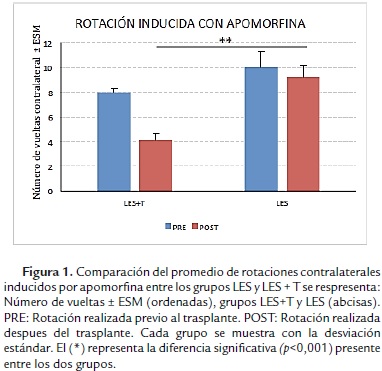 Actividad rotatoria. Para evaluar la lesión se llevó a cabo la prueba de actividad rotatoria inducida por inyección intraperitoneal de apomorfina (Sigma Aldrich, U.S.), (0,5 mg/kg de peso) (Mendez y Finn, 1975; Issy et al., 2015), 15 días después de producida la lesión y un mes después del trasplante. La conducta rotatoria se evaluó registrando el número de vueltas completas (360°) contralateral al hemisferio lesionado durante 90 minutos luego de la inyección de apomorfina.