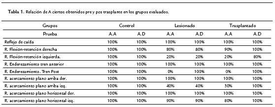 Test Neurológico. La respuesta de los grupos al test neurológico permitió valorar la influencia de la lesión en el estado neurológico de los animales pre y post tratamiento, mostrando un soporte valioso que valoró la influencia de la lesión y posteriormente el trasplante; a continuación se muestran las tablas de resultados de las pruebas desarrolladas a cada uno de los grupos.