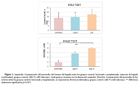 Pole test. Un mes después del trasplante, los animales demostraron en esta prueba su recuperación en cuanto a la corrección de posturay estrategias de descenso, al comprarlo con los grupos control intacto y animales lesionados. El Anova reveló para la variable, diferencia significativa entre los grupos, (p<0,001) que se enfatizó entre los grupos control y lesionado, mientras el grupo trasplantado ocupó una posición intermedia. (Ver Fig. 2).